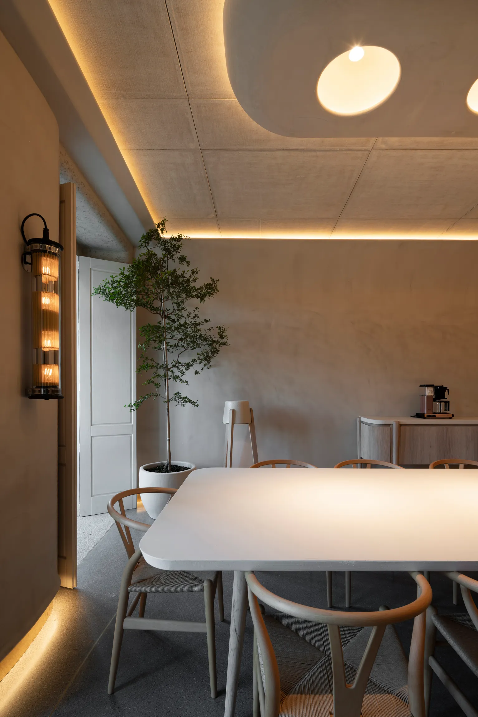 La selección de materiales se ha realizado bajo criterios de sostenibilidad, durabilidad y coherencia estética, incorporando soluciones ecológicas y recicladas como el corcho natural o la tela de saco, que aportan textura, calidez y personalidad al espacio.